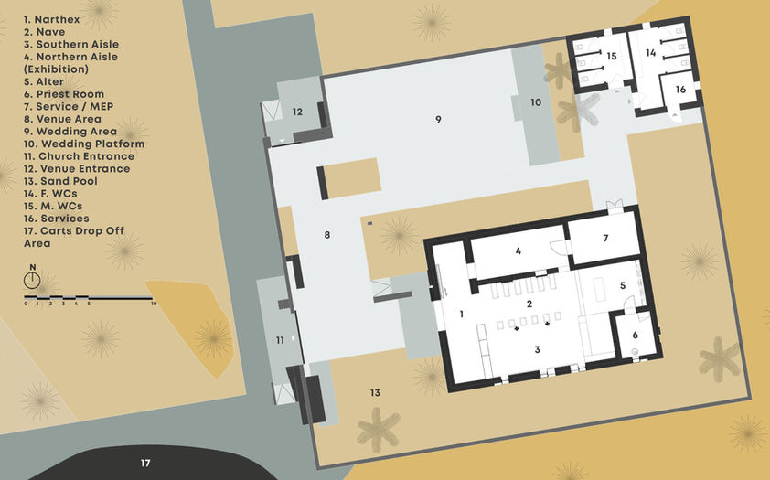 The Church design interprets Sir Bani Yas historical Church in its size, context, materiality and systems, yet presents a contemporary twist to it. The design of the new building relies on a monolithic form of raw aesthetics. The imperfections of the church skeleton texture traces the dramatic and authentic walls of the historical church which eventually gives the visitor of the new church a maximized interaction with the original church, yet a lack of detail that they are used to having in an ordinary space. The design of the new Sir Bani Yas church draws inspiration from various elements as follows.